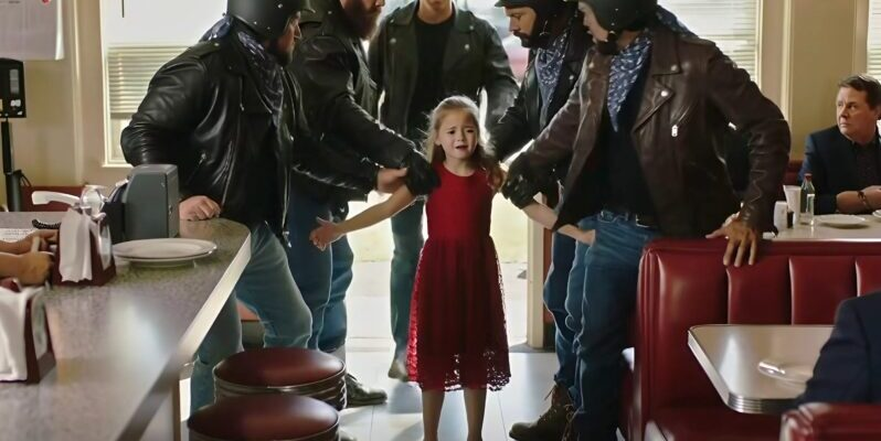 A little girl burst through the door — no more than seven years old. Her red dress was torn, her bare feet covered in dust, her cheeks streaked with tears. Without a second’s hesitation, she ran straight toward the bikers, not the waitress, not the church ladies by the window.