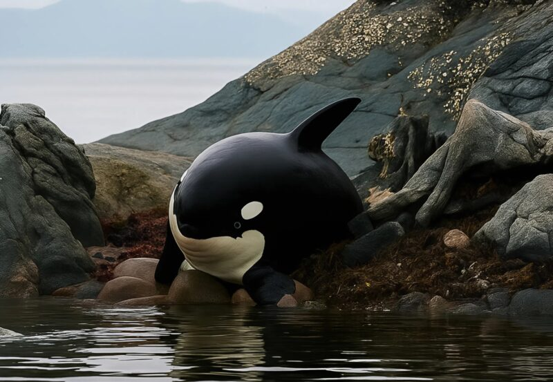 The young orca, crying desperately, was calling out to her pod. Her body, used to the freedom of endless waters, had become trapped among sharp rocks.