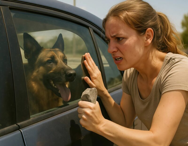 There was indeed water — but in a sealed bottle. I was furious. How is a dog supposed to drink from a closed bottle?! I couldn’t wait any longer. I grabbed a nearby rock and hit the window with full force. It shattered with a loud crash. The car alarm went off, but I didn’t care.