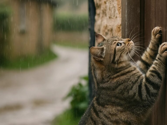 A cat meowing outside the basement door.