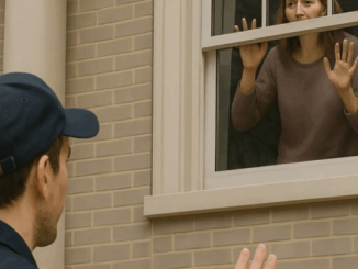 Behind her, under the porch light, her husband Daniel leaned against the doorframe, one arm around a young woman in a red trench coat. His eyes were distant, expression cold, like he was saying goodbye to a stranger.