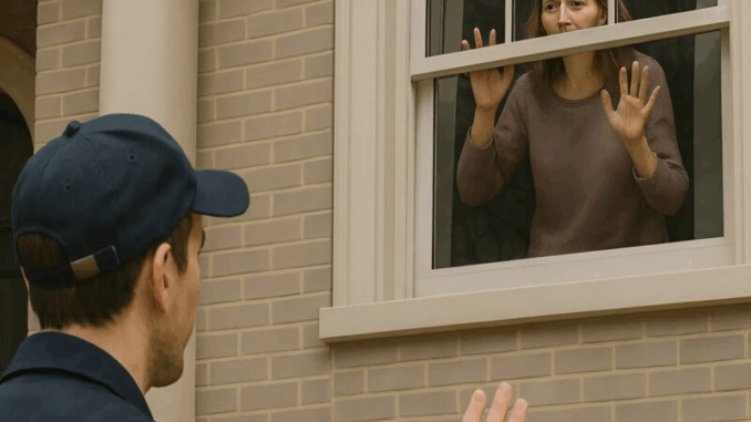 At the window stood a woman of about forty. She was staring straight at him. The courier instinctively raised his hand, thinking she was simply greeting him. But her gestures were not a greeting. She was pounding her palms against the glass, waving her arms desperately, and shouting something while pressing her face to the window.