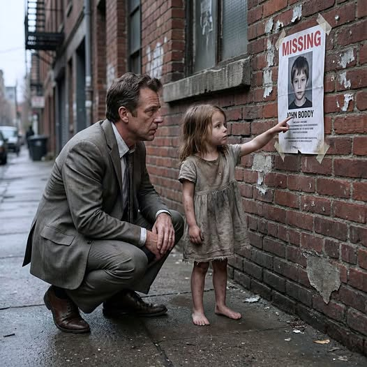The millionaire was putting up posters on the street, desperate for the slightest clue about his missing son, when a little girl approached slowly, staring at the photo like she’d seen a ghost.