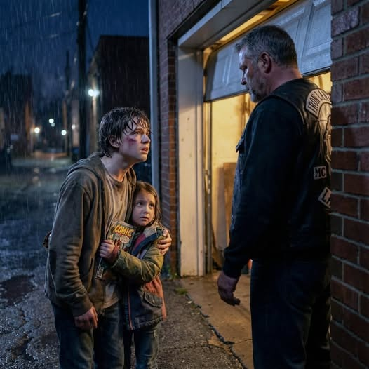 A kid stands there, fourteen, maybe fifteen. Dirt is streaked across his cheek, his hoodie is torn at the sleeve, and his eyes look too old for his face. Behind him, barely visible in the dim light of the alley, is a little girl clutching a comic book like it’s the only solid thing left in the world.