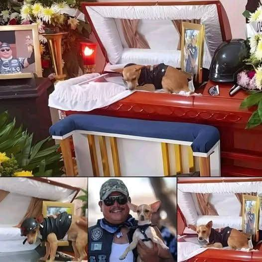 A Chihuahua dog says goodbye to his human companion who lost his life in a motorcycle accident on the San Fernando-Reynosa highway , after a pickup truck crossed into him and he lost control.