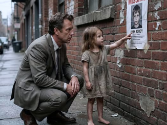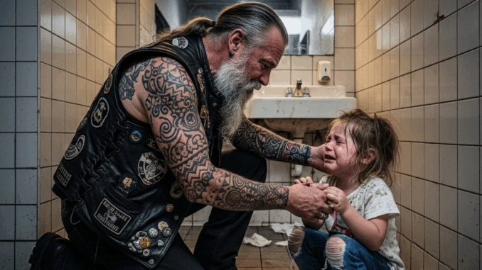 Old biker found 6-year-old girl hiding in the restaurant’s bathroom at midnight, bruised and terrified, begging him not to tell her stepfather where she was.
