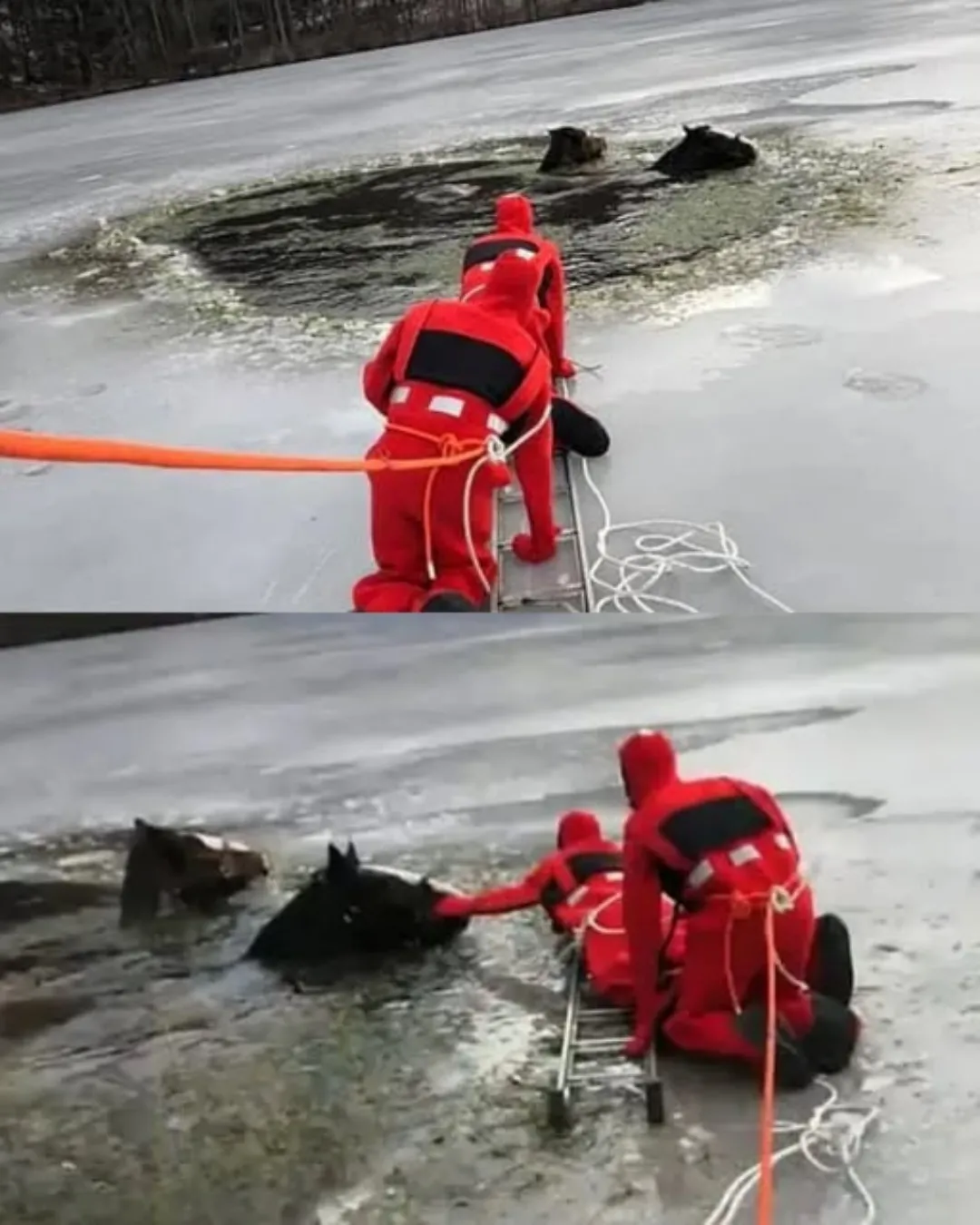 By the time rescuers arrived, the scene was heartbreaking. The two animals were trapped — half-submerged, exhausted, and terrified — their massive weight making it impossible to lift them out. Every attempt to pull them failed. The ice groaned with each movement, threatening to collapse further.