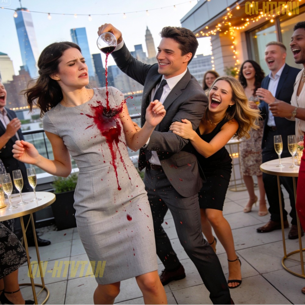 I still remember the sound the wine made when it hit the fabric. A thick, wet splash that cut through the music and laughter like a gunshot. My only decent dress — pale gray, knee-length, simple but elegant — turned crimson in an instant. It clung to me, heavy and cold, the liquid sliding down my skin in sticky trails. For a moment, I couldn’t even move. The shock hit before the humiliation.
