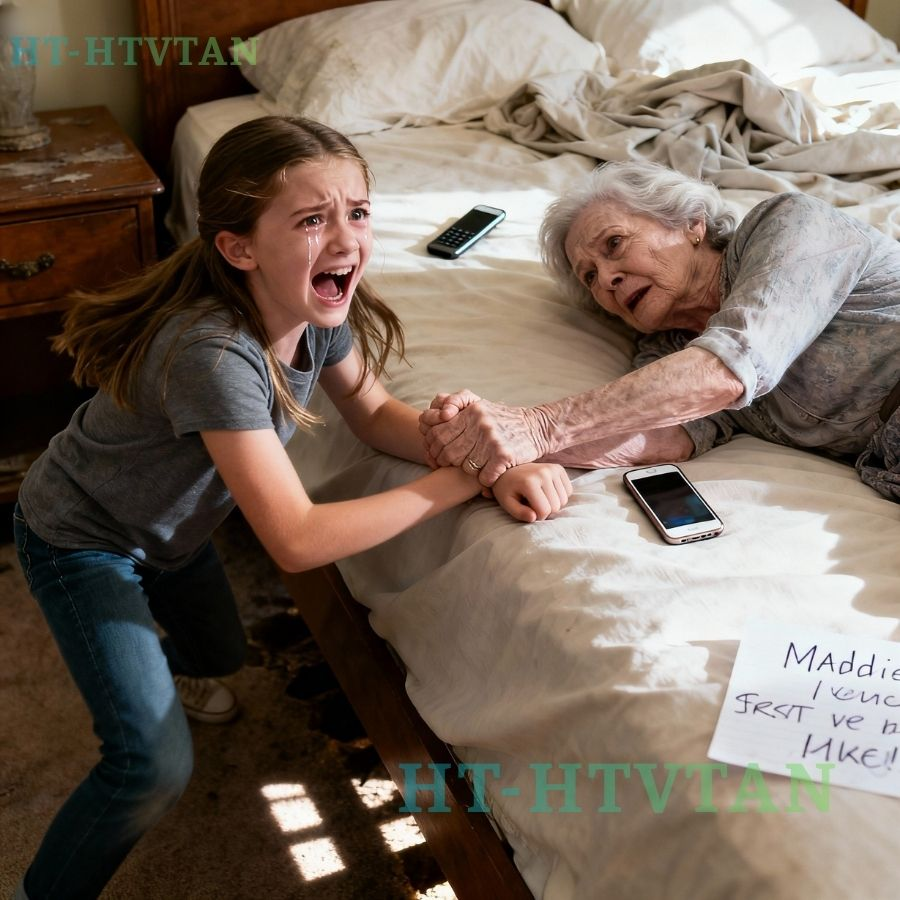 She was in bed, pale as paper, lips cracked, eyes halfopen, no water on the nightstand, no snacks, no meds, no call button, nothing. Maddie made a broken sound and ran to the bed. Grandma,” she cried, grabbing Evelyn’s hand. Evelyn’s fingers were cold. Maddie looked up at me, terrified. “Mom, she’s dying.