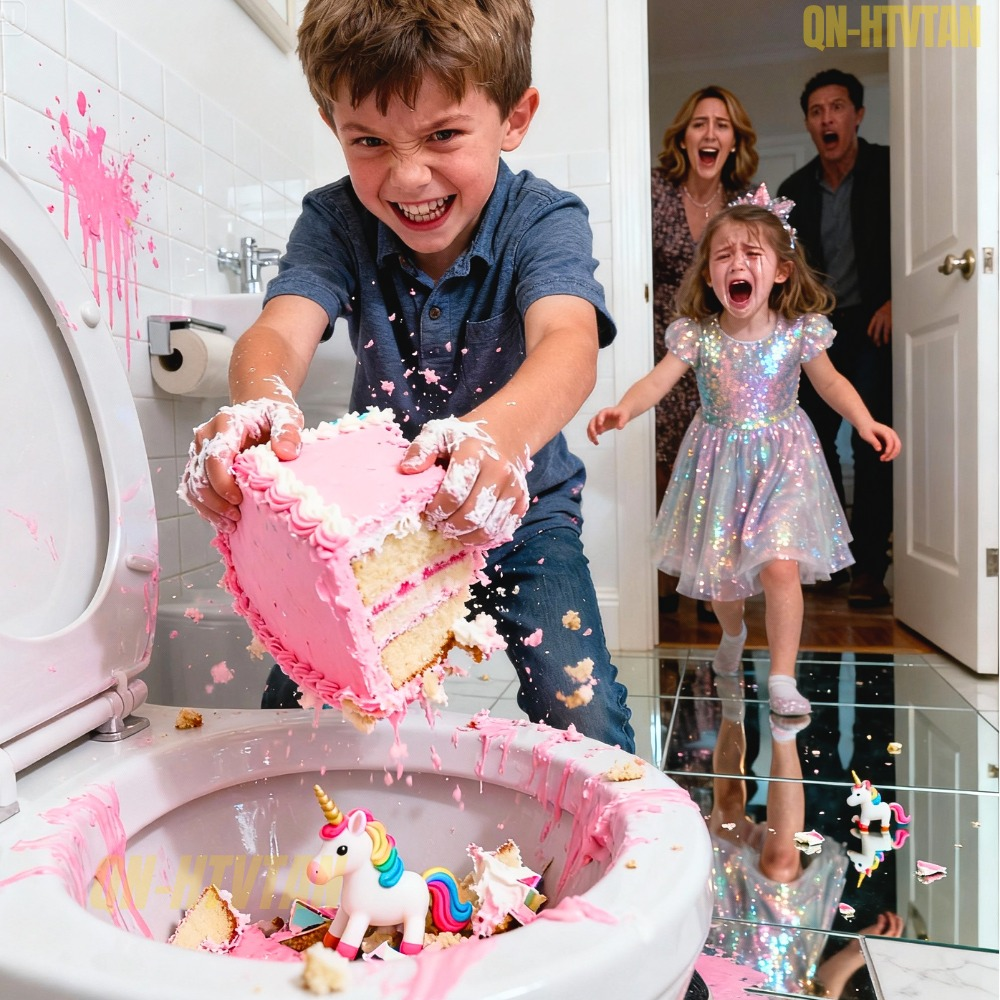 The sound wasn’t loud, but it was final—a wet, muffled splat as the cake hit the water. Pink frosting exploded across the white porcelain, dripping down the sides. The unicorn horn snapped in half, one fondant ear slid into the toilet, and frosting streaked the tile floor like paint.